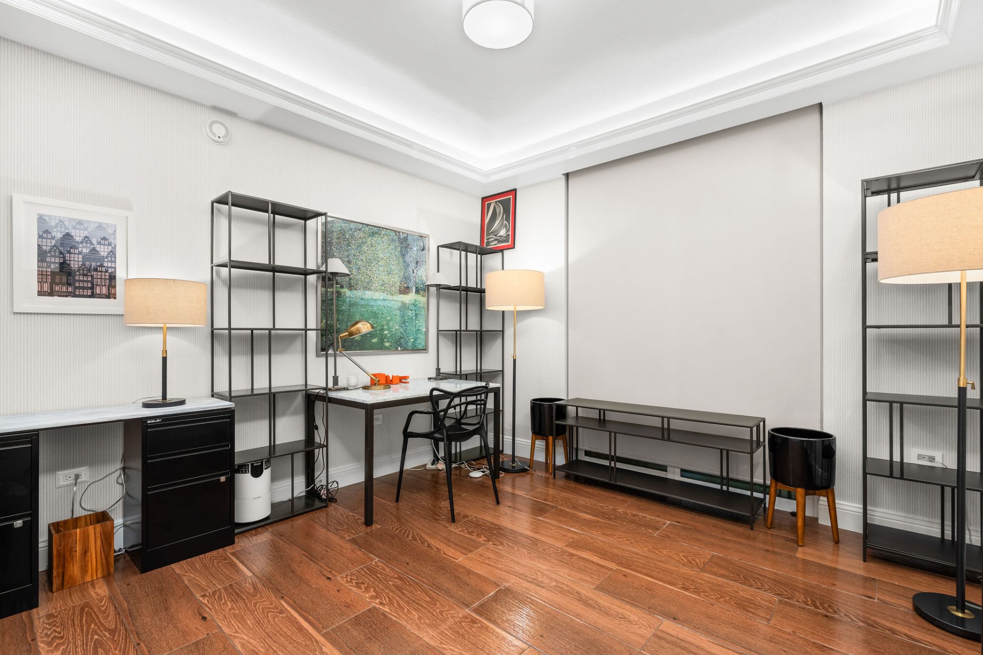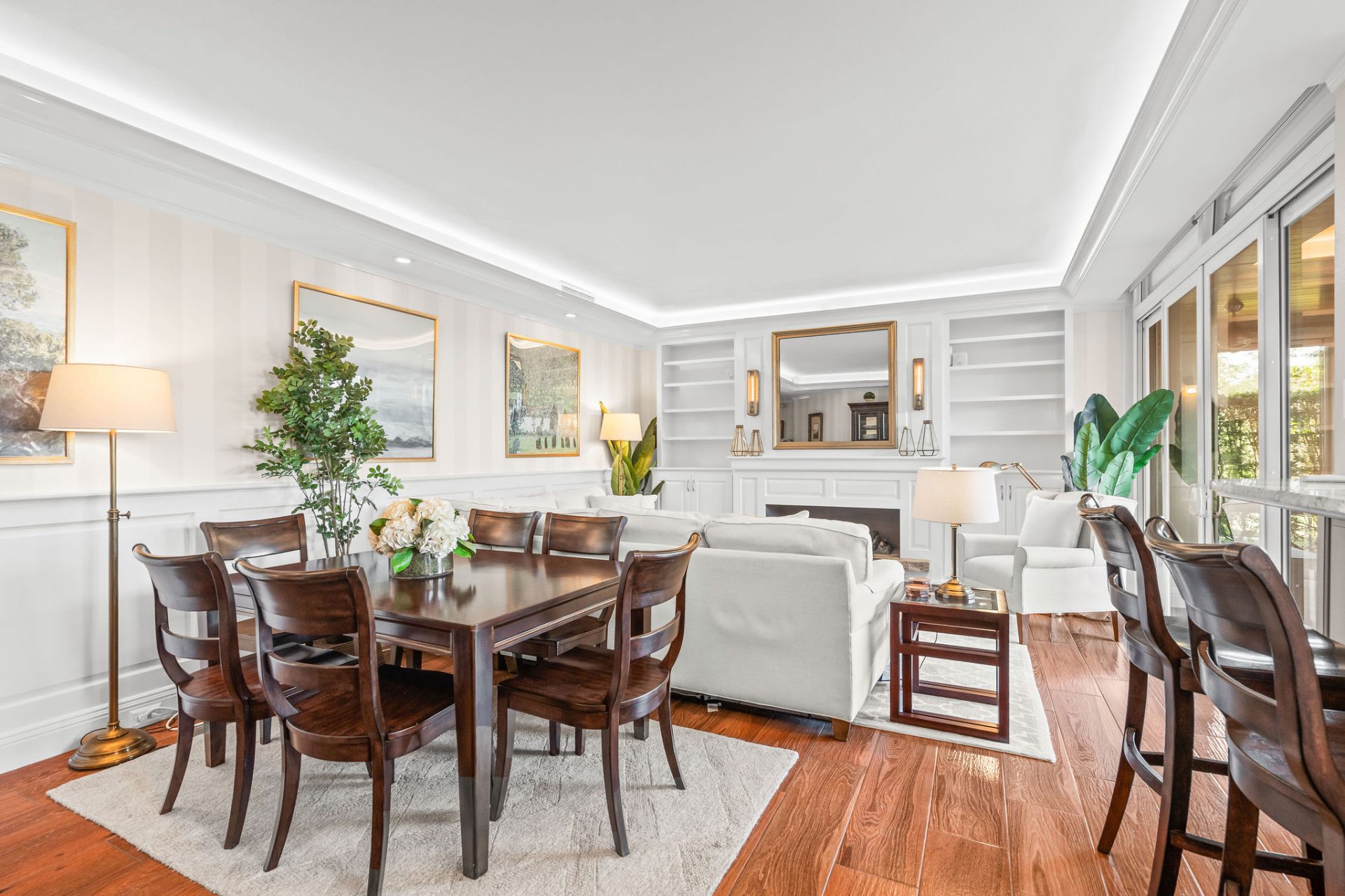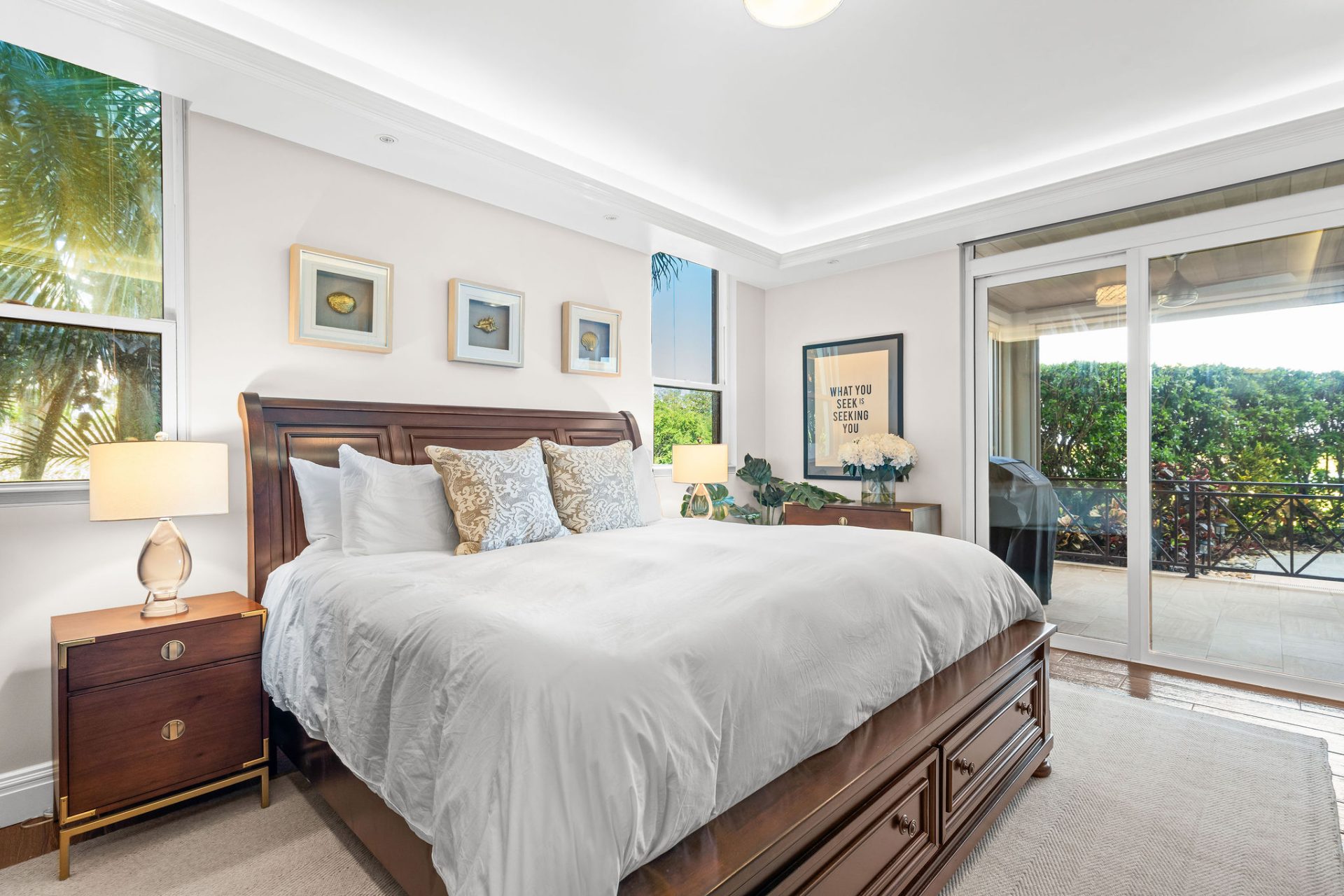 The residence showcases the highest level of craftsmanship throughout: Belgian hurricane-rated double-pane glass with Argon gas, electric storm shutters, custom cedar wainscoting, millwork, built-ins, and trim, Farrow & Ball wallpaper accents, and ceilings ranging from 9–10′ with Level 4 and 5 finishes.