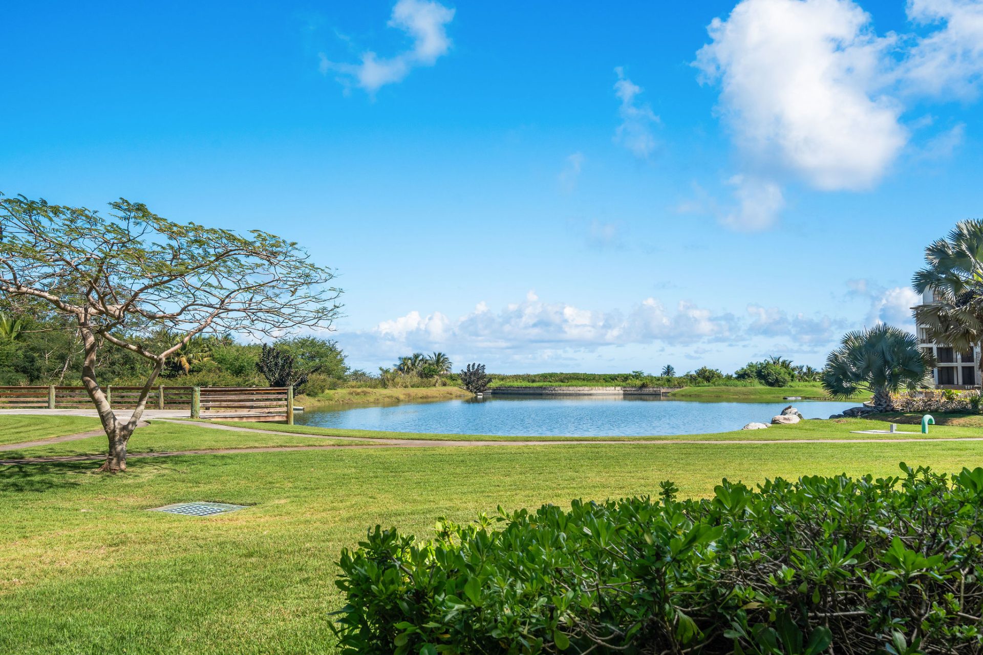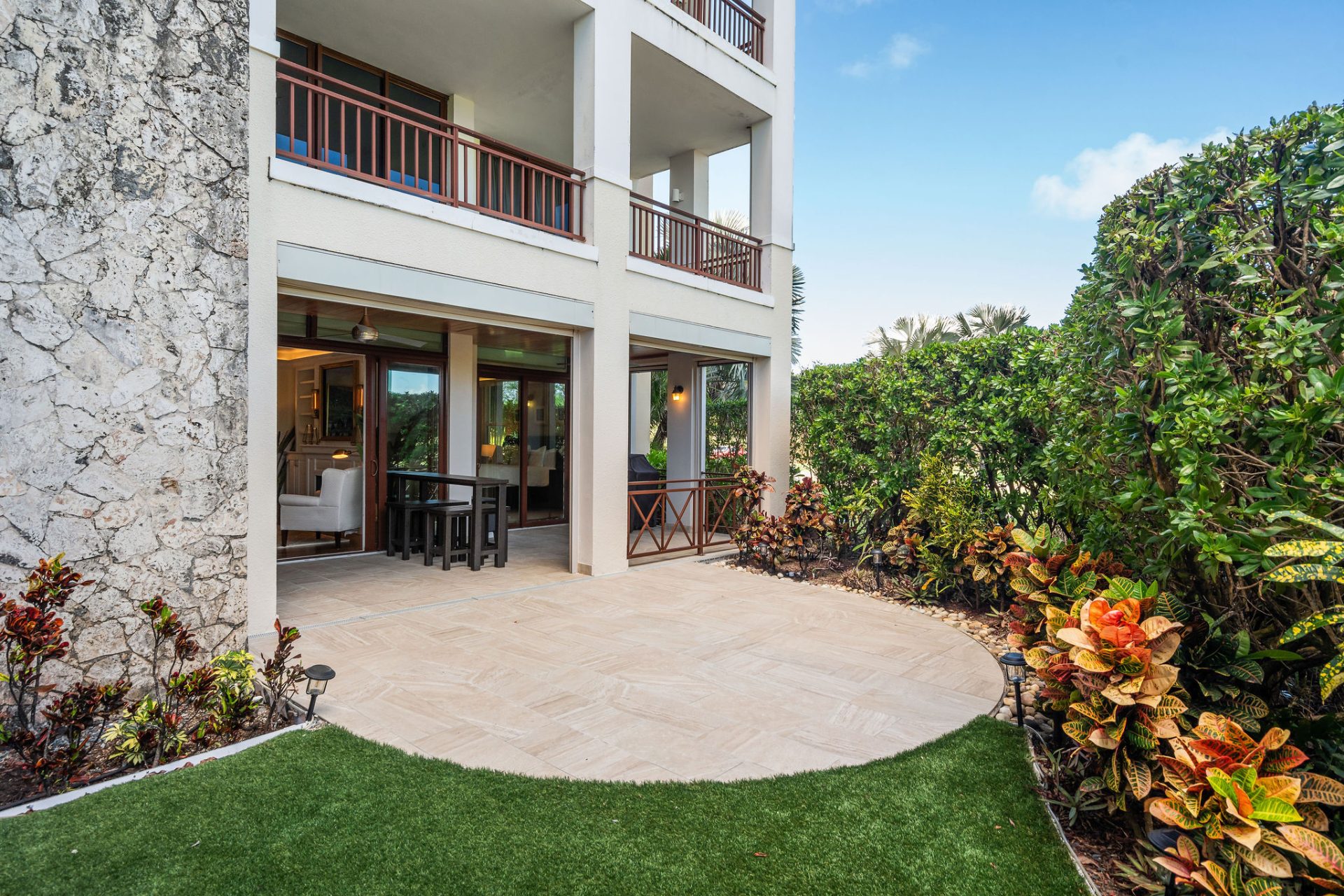 This first-floor, direct ocean-facing unit features a private gated garden in Building One, protected by natural reefs and offering serene views across lush landscaping, a freshwater pond, and the sea beyond. Entry is through a custom handcrafted 2.5″ steel-core door clad in cedar, set over an ipe threshold, designed to withstand hurricane-force conditions.