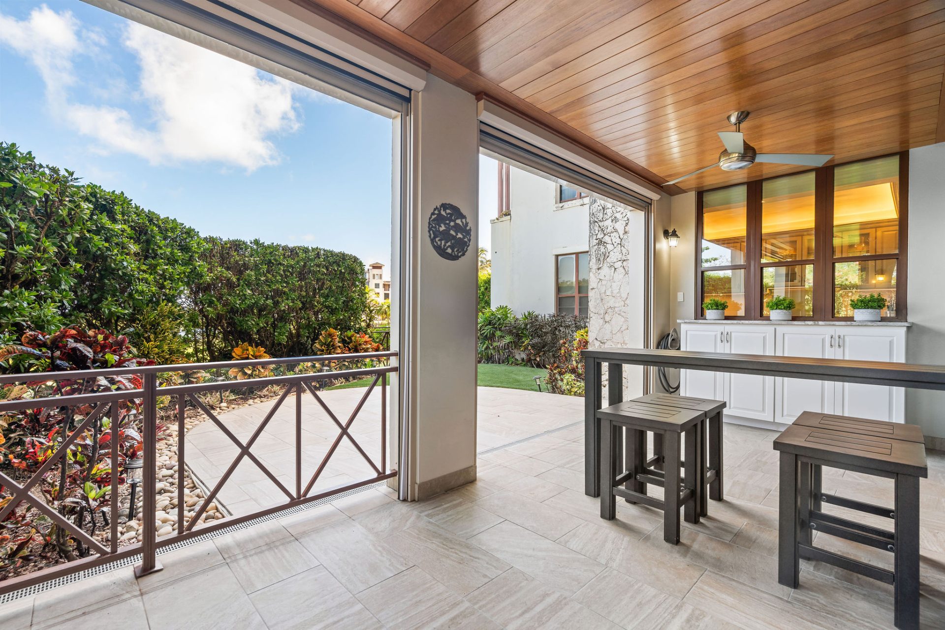Living spaces flow seamlessly to a covered patio with cedar-planked ceiling, electric sunscreens, ceiling fans, and a private landscaped garden with advanced drainage, irrigation, and lighting. A Dimplex Optimist fireplace–the only one of its kind in the Caribbean–features a hidden television behind a one-way mirror.