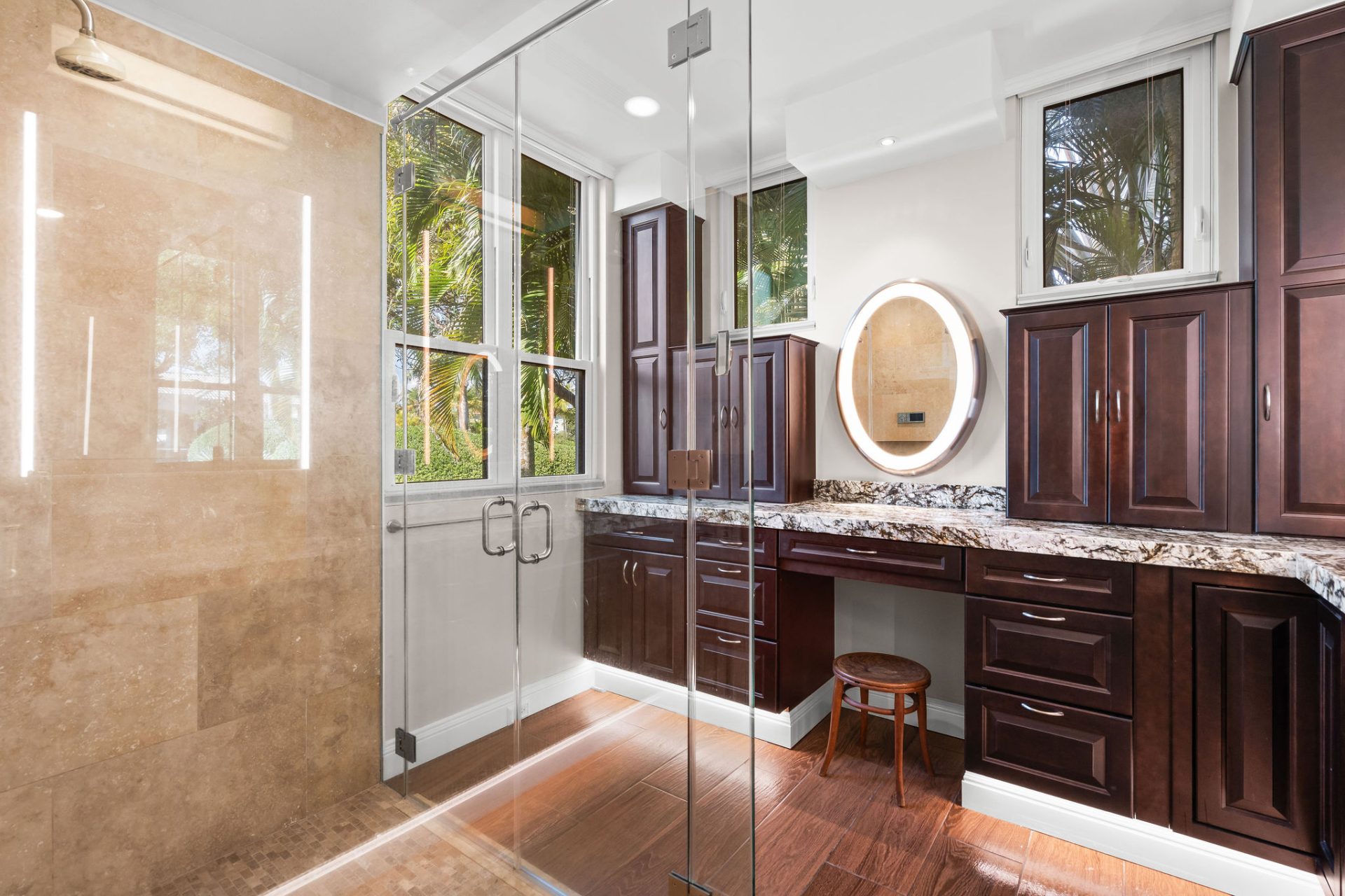 The primary suite offers a custom walk-in cedar closet with layered lighting, built-ins, and displays, along with a spa-inspired bath featuring dual digital showers, double vanities, and extensive storage. Two additional guest bedrooms, a guest bath, powder room, and dedicated laundry complete the layout.